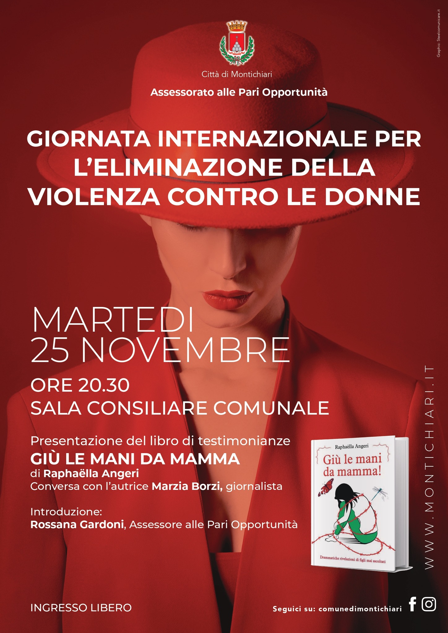In occasione della Giornata internazionale per l'eliminazione della violenza contro le donne l'Assessorato alle Pari Opportunità propone un incontro dedicato alla presentazione del libro di Raphaëlla Angeri dal titolo "Giù le mani da mamma!", testimonianze di figli le cui madri hanno subito abusi e violenze. Dopo l'introduzione dell'Assessore Rossana Gardoni l'autrice dialogherà con la giornalista Marzia Borzi. L'ingresso è libero e gratuito.